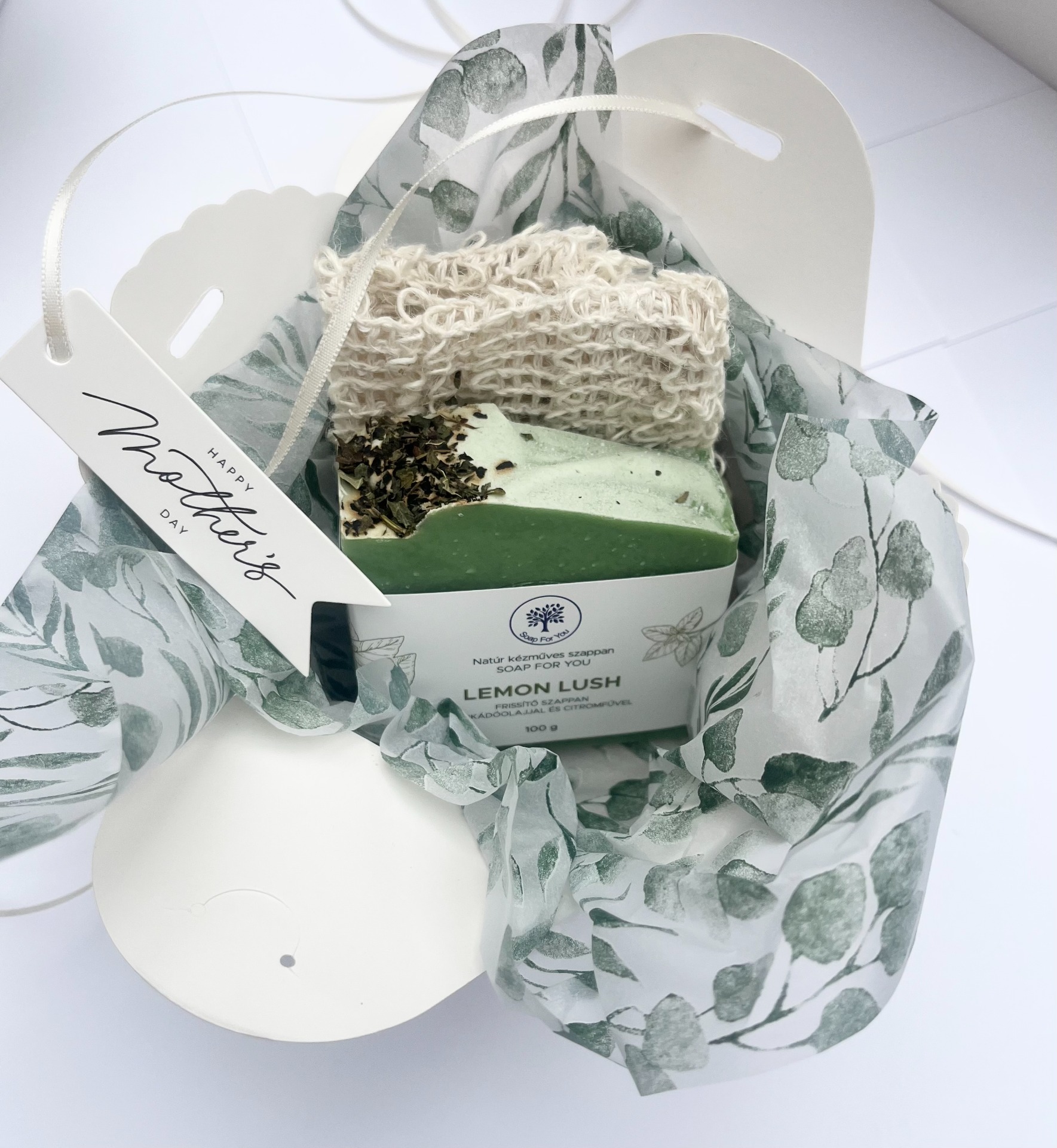 Kézműves szappan citromfűvel, eukaliptusszal, avokádóolajjal és zöld agyaggal díszdobozban.