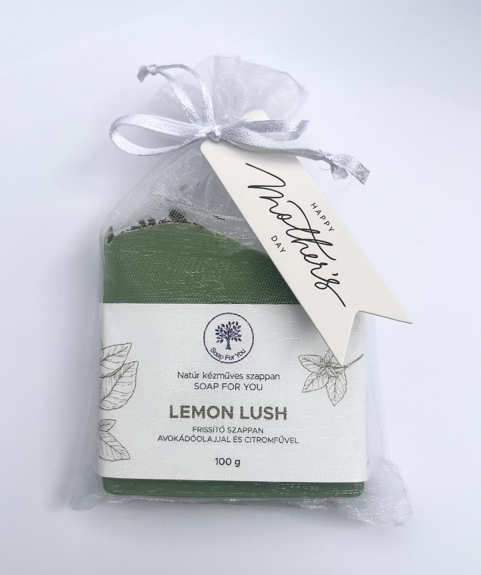 Kézműves szappan citromfűvel, eukaliptusszal, avokádóolajjal és zöld agyaggal organza tasakban.