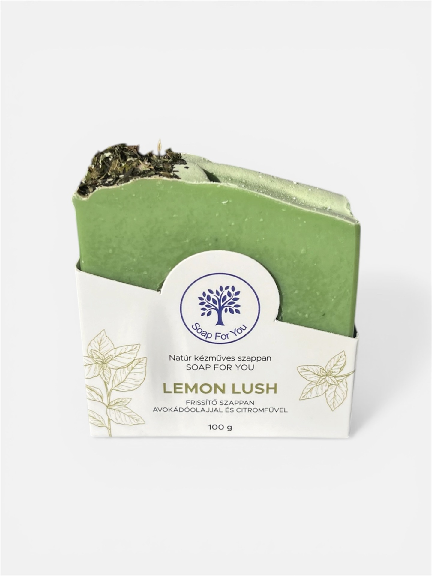 Frissítő szappan citromfűvel, eukaliptusszal, avokádóolajjal és zöldagyaggal.